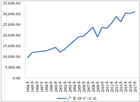 2017年全球鉻礦產量約為31,000.00千公噸,同比增長2.65%。其中,南非是世界上最大的鉻礦生產國,2017年鉻礦產量占全球的48.39%,哈薩克斯坦、印度、土耳其分別比17.42%,10.32%和9.03%。2017年南非鉻礦產量為15,000.00萬噸,同比增長2.04%。