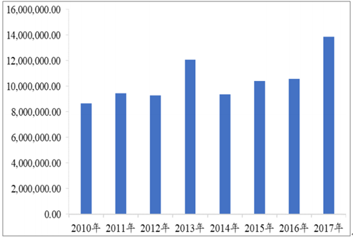 2010-2017年我國進口鉻礦數量變化(噸)