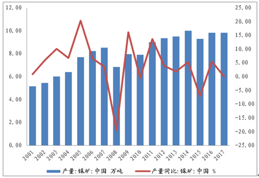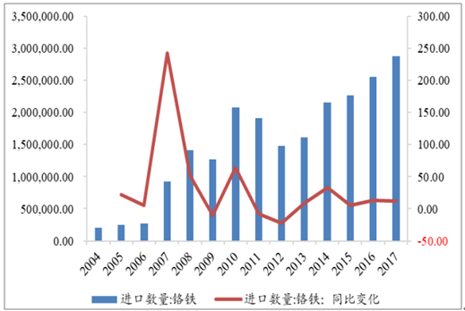 我國不銹鋼粗鋼產量逐年攀升,需求持續增長,我國對鉻礦需求預期將持續上升,2017年我國鉻礦進口數量達13,865,021.72噸,同比增長31.10%,鉻鐵進口數量達2,873,496.35噸,同比增加12.30%。