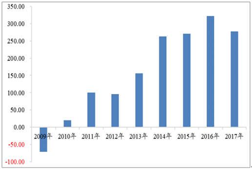 2009-2017年我國不銹鋼凈出口(萬噸)