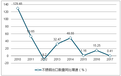 2009-2017年,我國不銹鋼出口數量年均復合增長率為28.37%;但近年來增速放緩,2017年實現不銹鋼出口數量395.30萬噸,同比增長0.41%,創歷史新高。據中國特鋼企業協會不銹鋼分會最新數據,2018年一季度全國出口不銹鋼102.4萬噸,與2017年一季度同比增加12.3萬噸,增長13.7%。