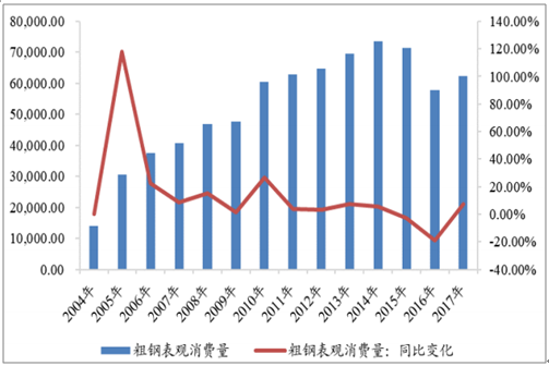 2017年,我國粗鋼表觀消費量為62,352.57萬噸,同比增長7.76%,創10年來最高增速;不銹鋼表觀消費量自2008年后持續高速增長,但近年來增速放緩,2017年,不銹鋼表觀消費量創歷史最高水平1984.68萬噸,增速為5.37%。