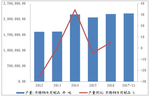 2015-2017年的產量可由不銹鋼日用品產量側面反映,在此期間,不銹鋼日用品產量穩定增長,2016年不銹鋼日用品產量216.09萬噸,同比增長5.23%,截至2017年11月,不銹鋼日用品產量已達217.83萬噸,預計2017年將穩速增長。