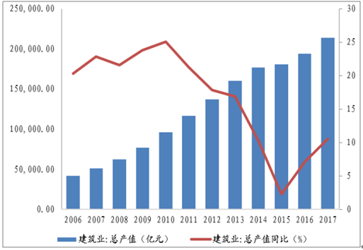 2006-2017年我國建筑業總產值(億元)及總產值同比(%)