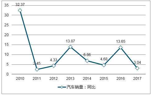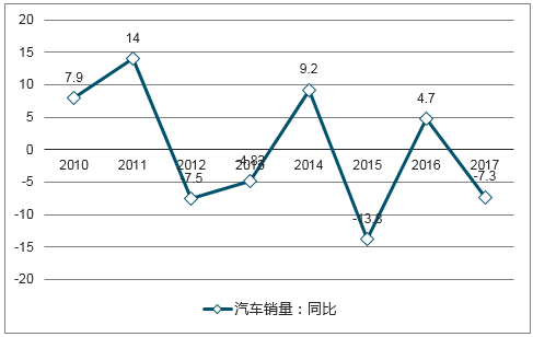 2008年-2017年汽車產量同比變化(%)