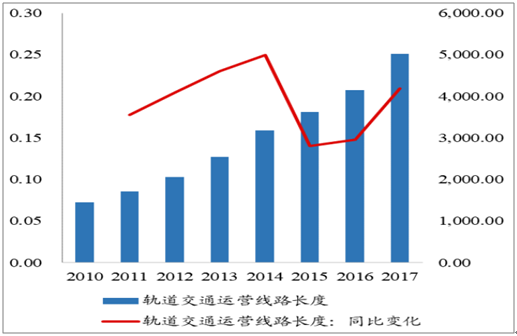 我國城市軌道交通運營里程數同比變化(%)